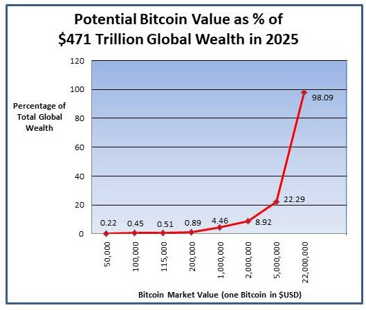 Forecast Bitcoin prices beyond today could potentially be anywhere between zero (post a major price crash for any reason - political, war, financial crash or technical/fraud issues) and £22 million in a scenario where the collective value of Bitcoin might align with the total wealth of the world. The following chart shows the Total Bitcoin value in various scenarios as a percentage of Total Global Wealth reported to be nearing $471 Trillion in 2025, provided by Forbes sourced through the 2025 UBS Global Wealth Report.