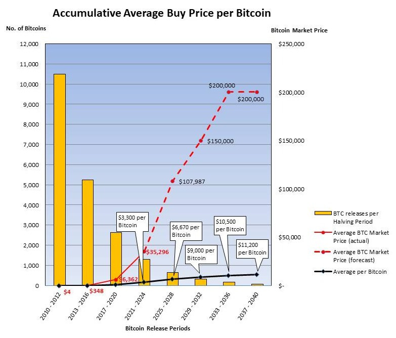 The following graph shows how the market price of Bitcoins has risen since release at the end of 2009 compared to the actual average price paid for those Bitcoins when first released, per halving period and on an accumulative basis up to the $11,200 estimate per BTC for the max. 21 million Bitcoins, with 1 million left to be released: